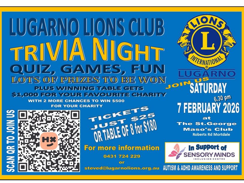 On Saturday 7 February, the Lions Club of Lugarno is running a fun filled evening of Trivia quizzes, games and good cheer. As always, the goal is to assist those who need our support.